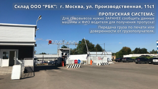Для согласования даты и времени самовывоза свяжитесь с менеджером, либо пишите на почту Адрес электронной почты защищен от спам-ботов. Для просмотра адреса в браузере должен быть включен Javascript.. Так же необходимо предоставить данные для пропуска на территорию склада: данные машины (модель, номер регистрации, номер региона) и ФИО водителя.